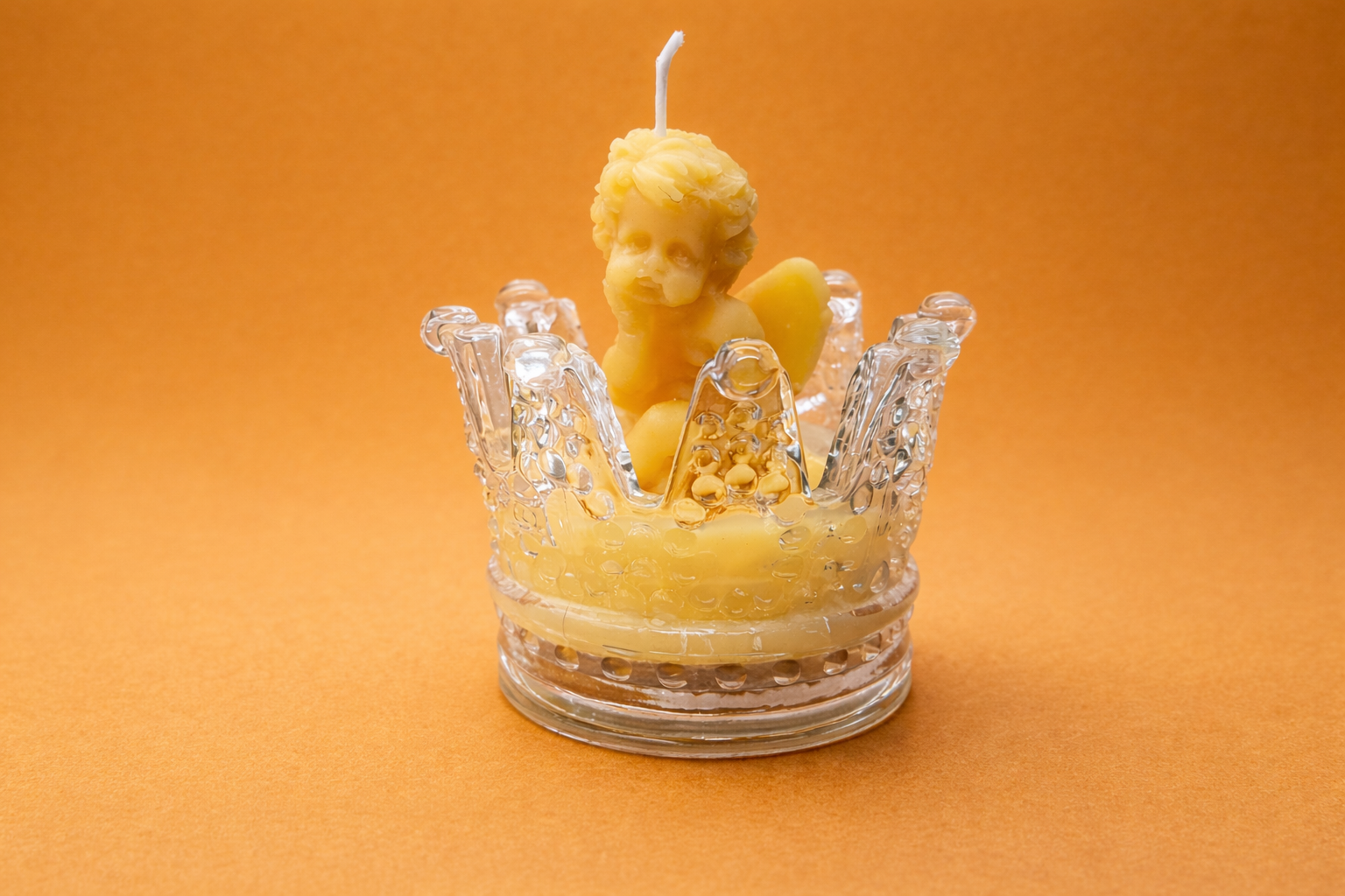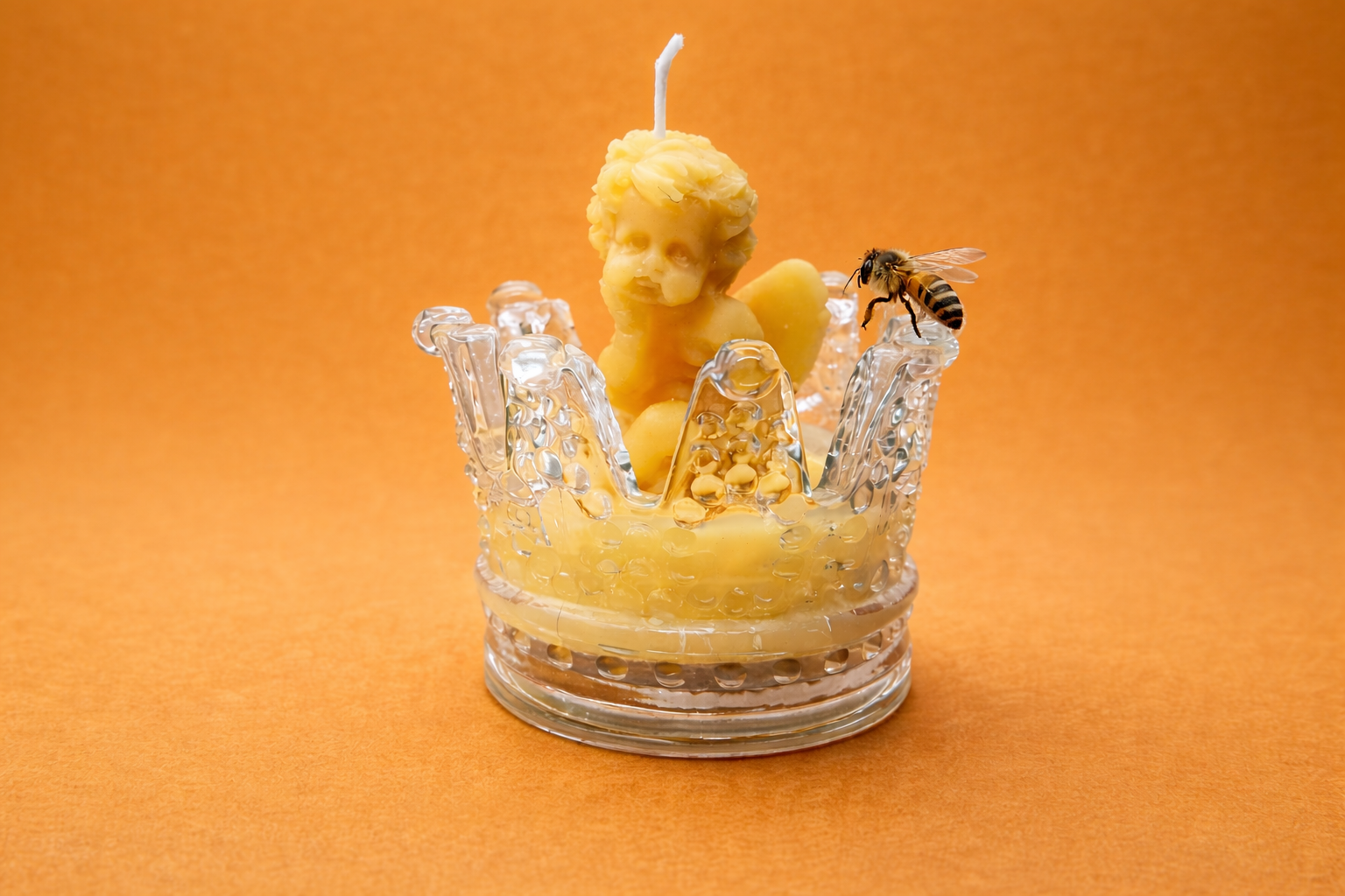Eingebettet in einen dekorativen gläsernen Kerzenhalter in Kronenform entfaltet die Kerze ihre besondere Wirkung. Das klare Glas bricht das Licht auf elegante Weise und unterstreicht den goldenen Schimmer des Wachses. Eine zarte Biene begleitet die Szene – als Symbol für Natur, Fleiß und die Ursprünglichkeit dieses handgefertigten Stücks 🐝✨.
