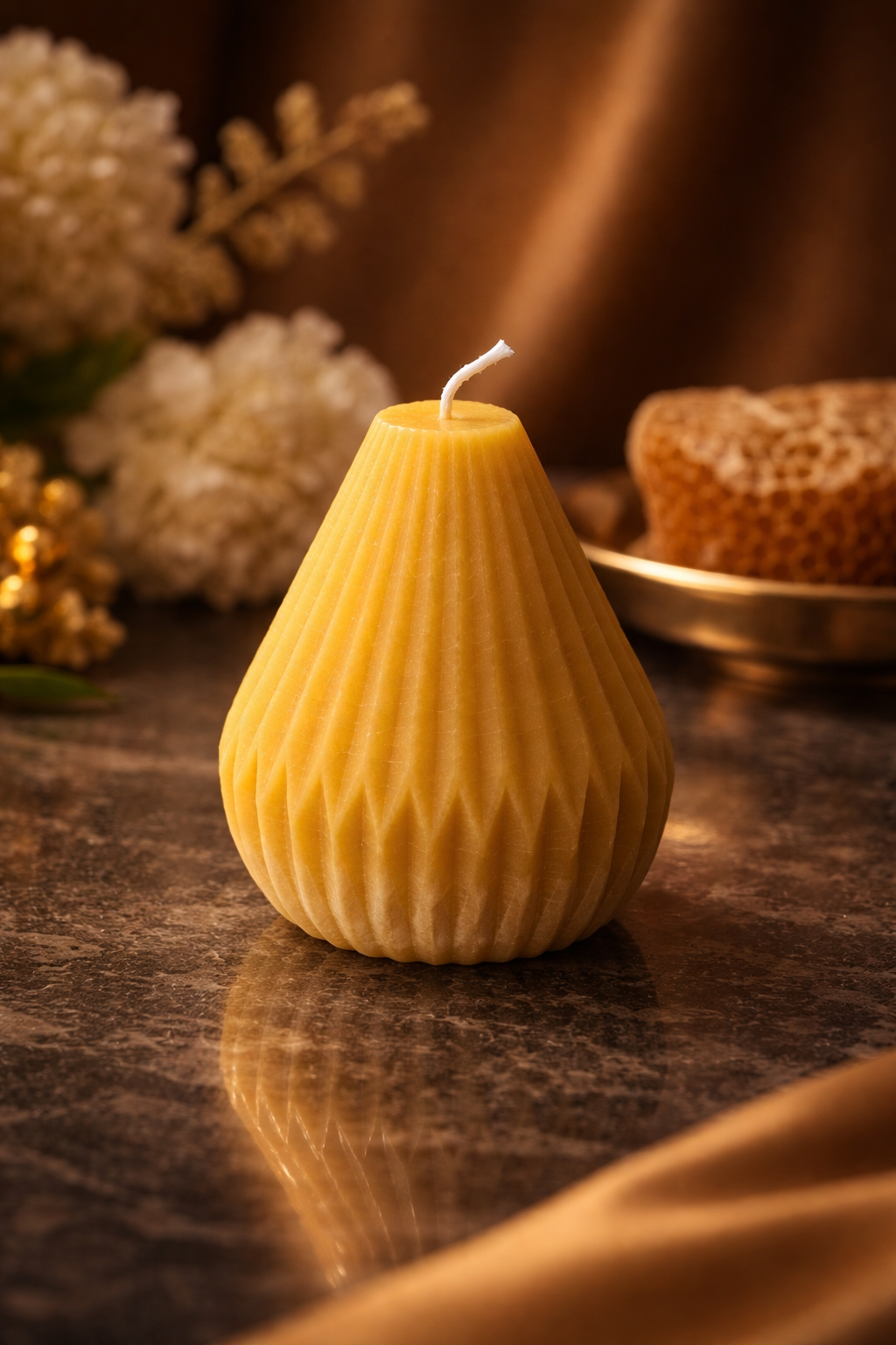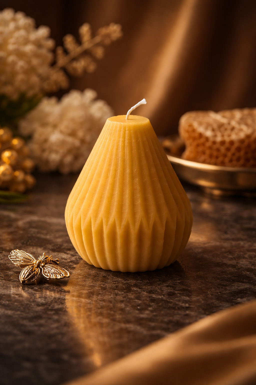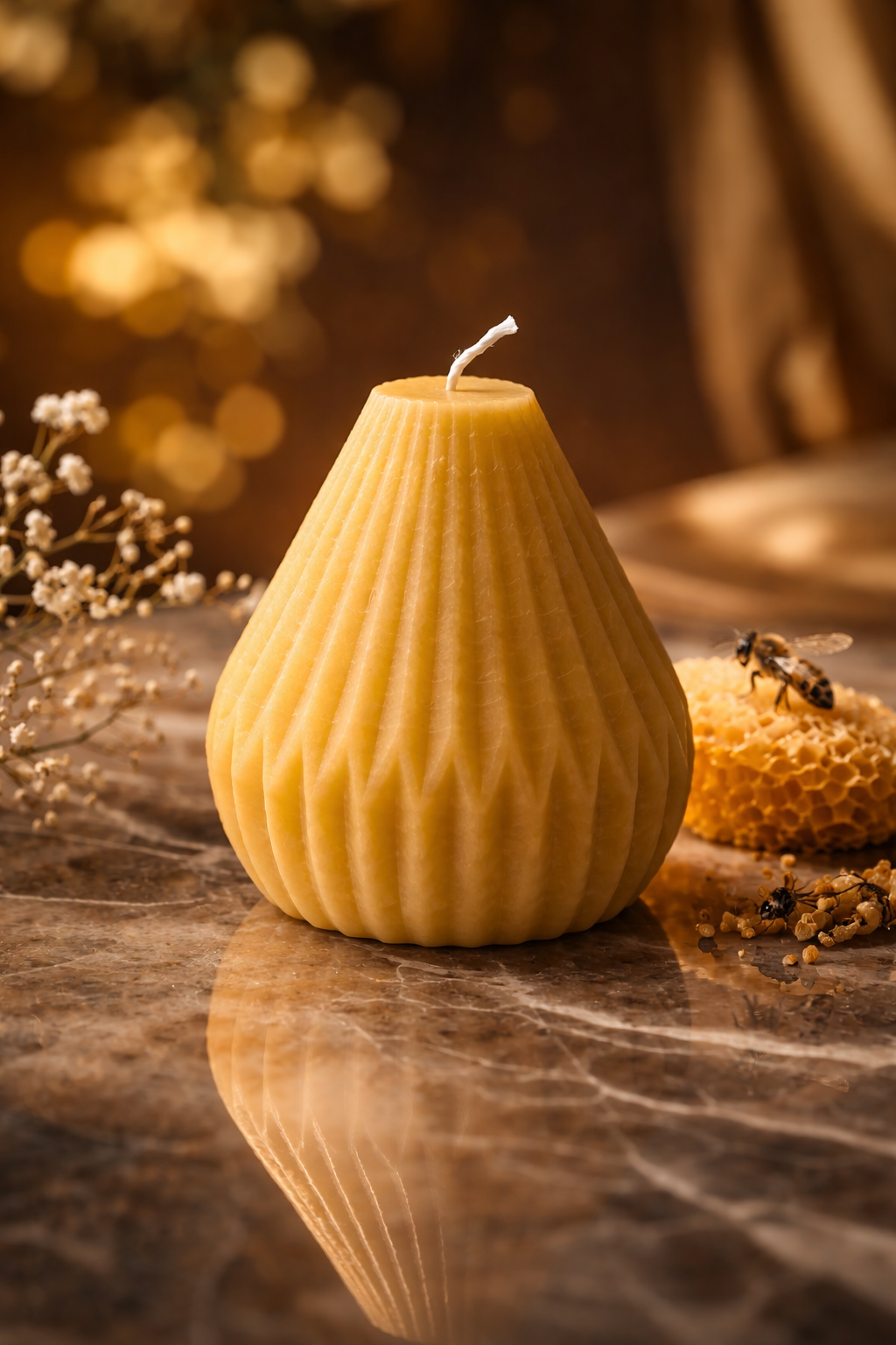 Diese edle Kerze aus 100 % reinem Bienenwachs wird in sorgfältiger Handarbeit gefertigt und ist inspiriert von der sanften Form eines Honigtropfens 🍯🐝. Die fein gerillte Oberfläche erinnert an fließenden, warmen Honig und verleiht der Kerze eine ruhige, organische Ausstrahlung – natürlich, harmonisch und zeitlos.