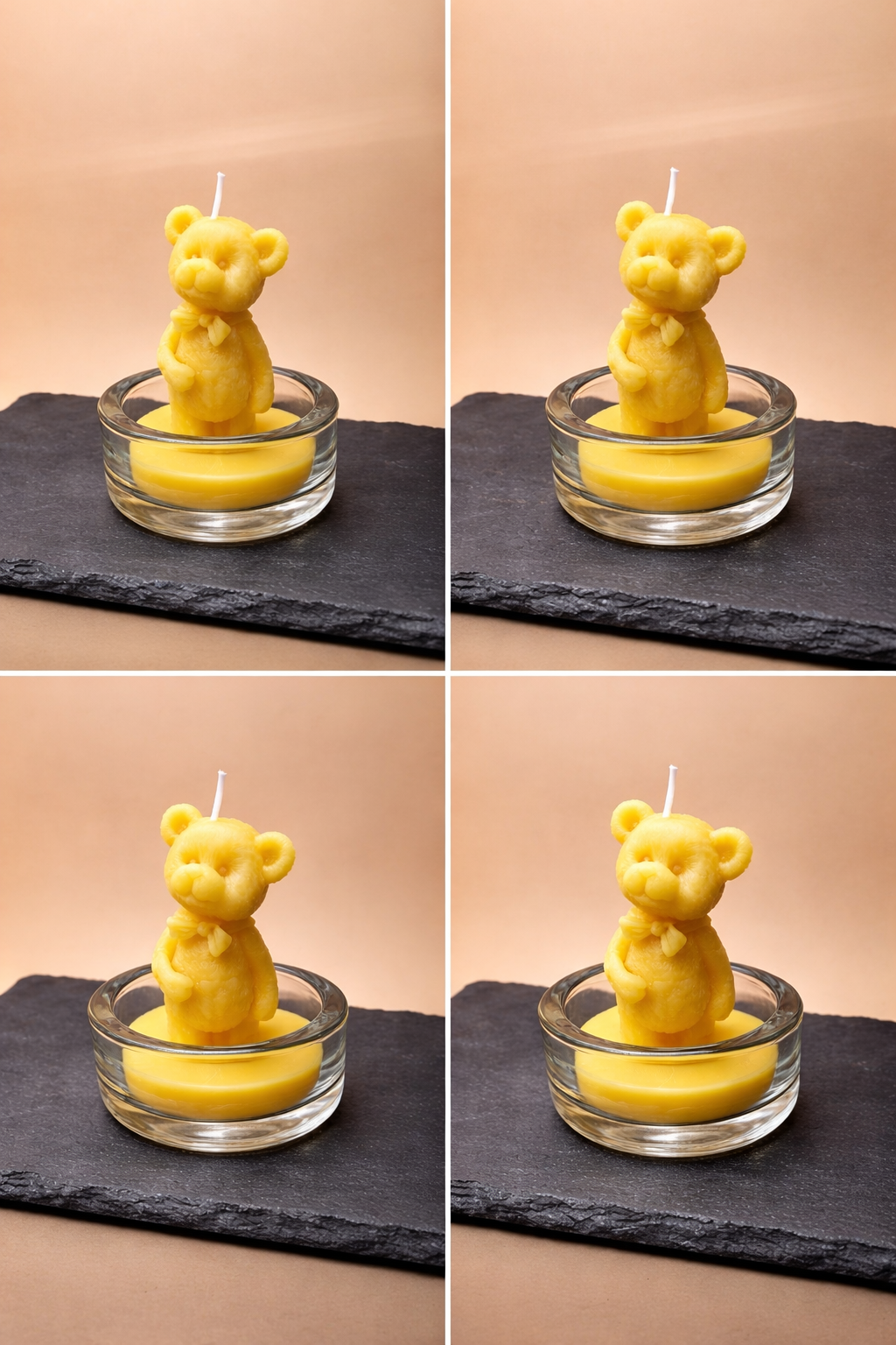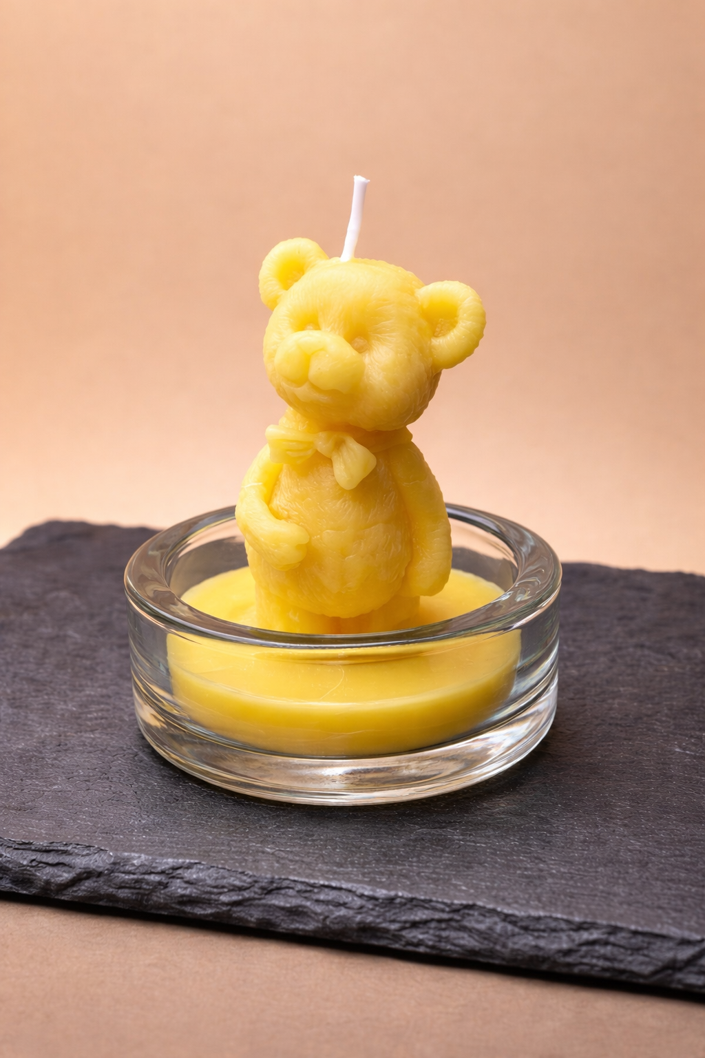 Ein kleiner BÀr, geformt aus warmem, goldenem Bienenwachs, ruht in seinem schlichten GlasgefÀà wie in einem stillen Honigbecken.