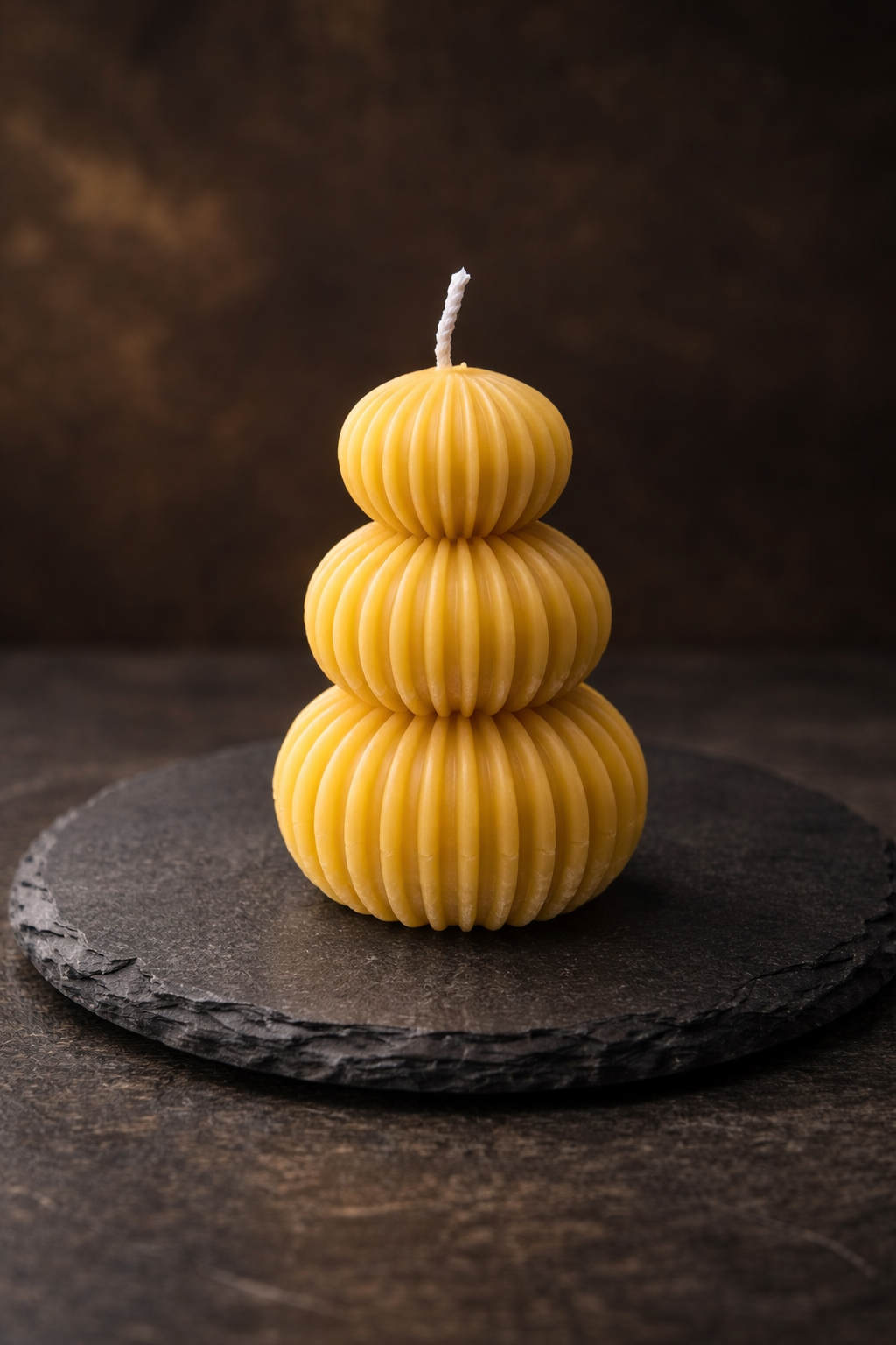 Die Skulpturkerze DreiKugel wird aus reinem Bienenwachs handgegossen und überzeugt durch ihre klare, dreistufige Form sowie die fein gerippte Oberfläche. Das natürliche Wachs verleiht der Kerze ihren warmen Honigton und eine ruhige, hochwertige Ausstrahlung.