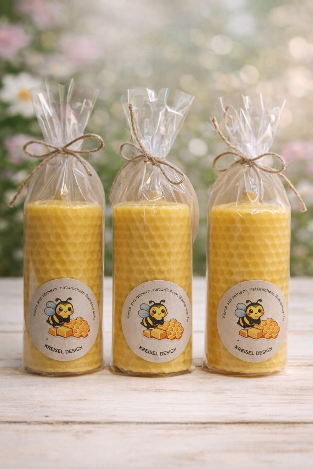 Sie entsteht aus einer echten Bienenwachs-Wabenplatte, die sorgfältig aufgewickelt wird. Dadurch bleibt die natürliche Wabenstruktur vollständig erhalten und jede Kerze erhält ihren charakteristischen, warmen Ausdruck.