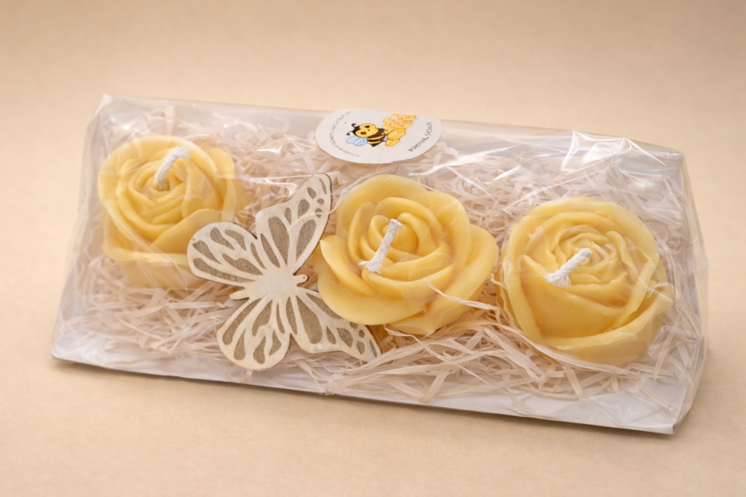 Geschenkset – Rosenkerzen aus Bienenwachs (3er Set)