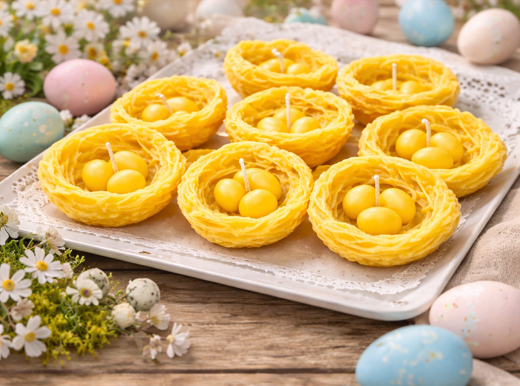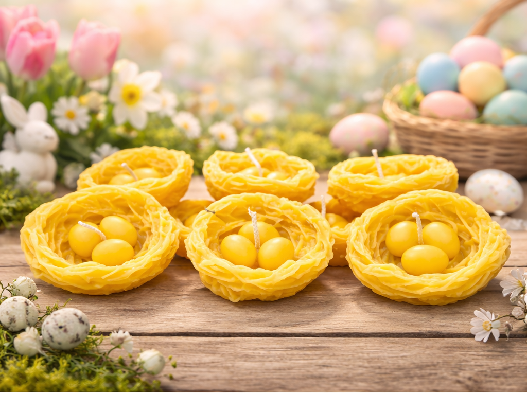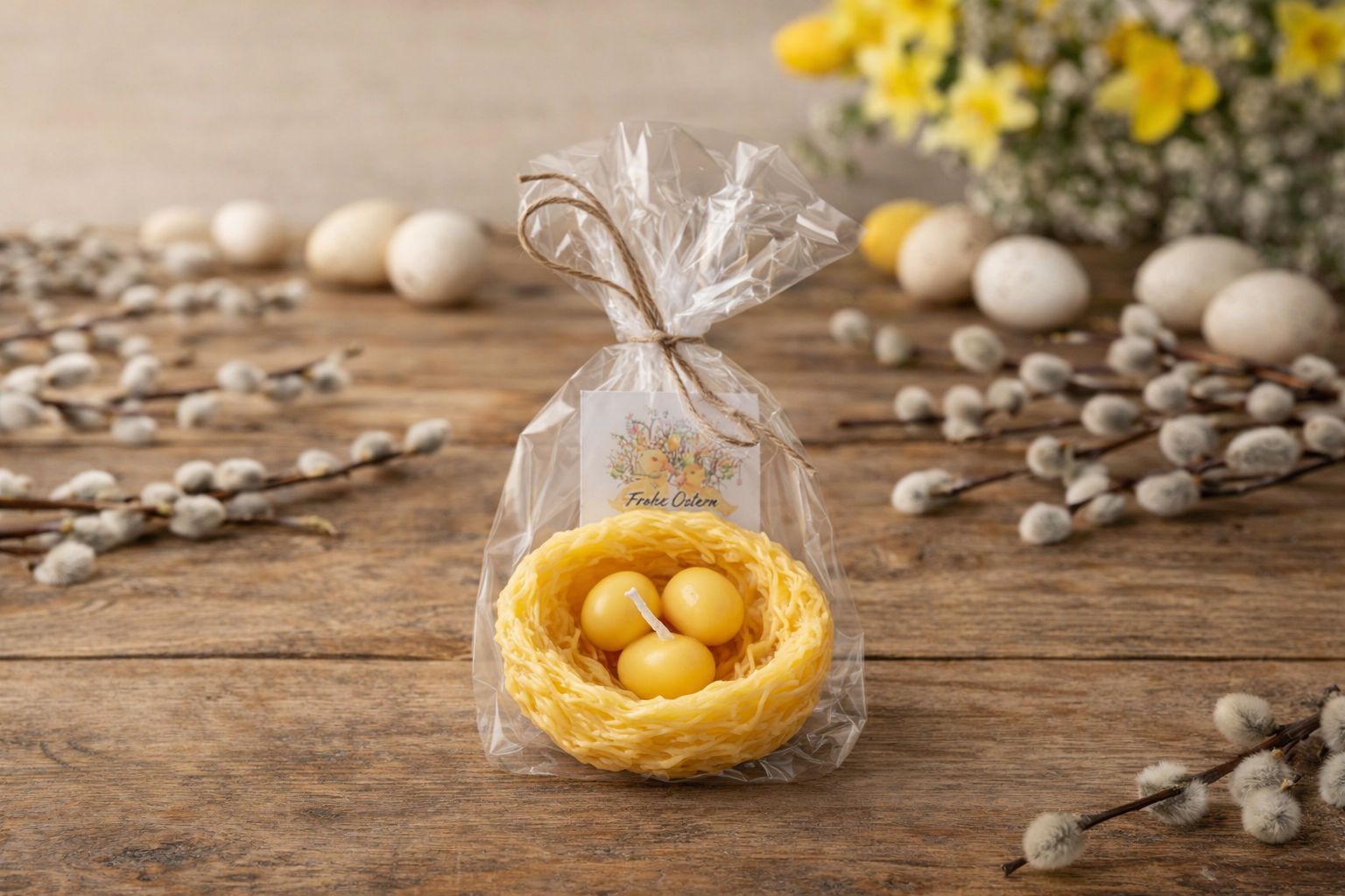 Die Kerze eignet sich ideal als Tischdekoration zu Ostern, als kleines Mitbringsel, für Mitarbeiter- oder Kundengeschenke oder als liebevolle Ergänzung zu einem Ostergeschenk. Mehrere Nester zusammen wirken besonders harmonisch – wie ein kleines Frühlingsarrangement.